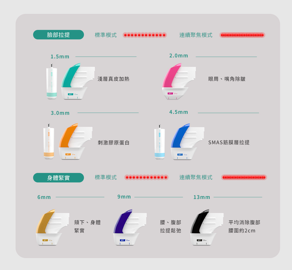 比起第三代海芙音波依照1.5-13mm等不同深度推出的7種探頭,「媚必提」Ultraformer MPT 的探頭規格也更加多元,具有2種形狀、7層深度,10款卡匣與共計20組自由切換的模式。