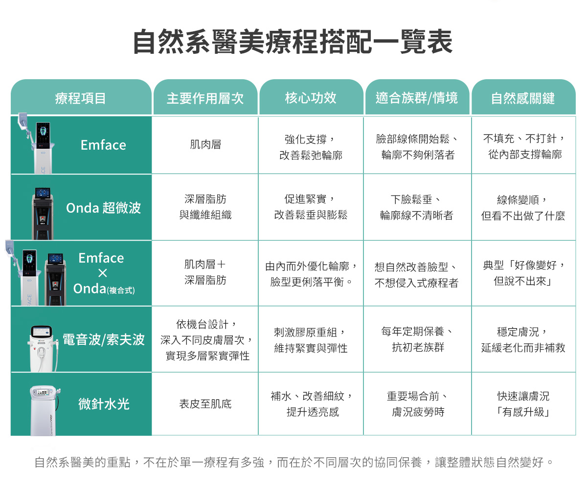 首先我會推薦的是 Emface 搭配 Onda 超微波。Emface 是目前少數能夠作用在「肌肉層」的非侵入式療程,透過高能量電刺激,誘發臉部肌肉自然收縮,強化支撐結構,改善鬆弛與輪廓線條;而 Onda 超微波則利用高頻微波能量,精準作用於深層脂肪與纖維組織,促進緊實、改善局部鬆垂與膨鬆感。兩者搭配,能在「不填充、不拉提、不打針」的情況下,讓臉部輪廓更俐落,屬於「看起來變順了,但說不出哪裡不一樣」的典型自然系療程。