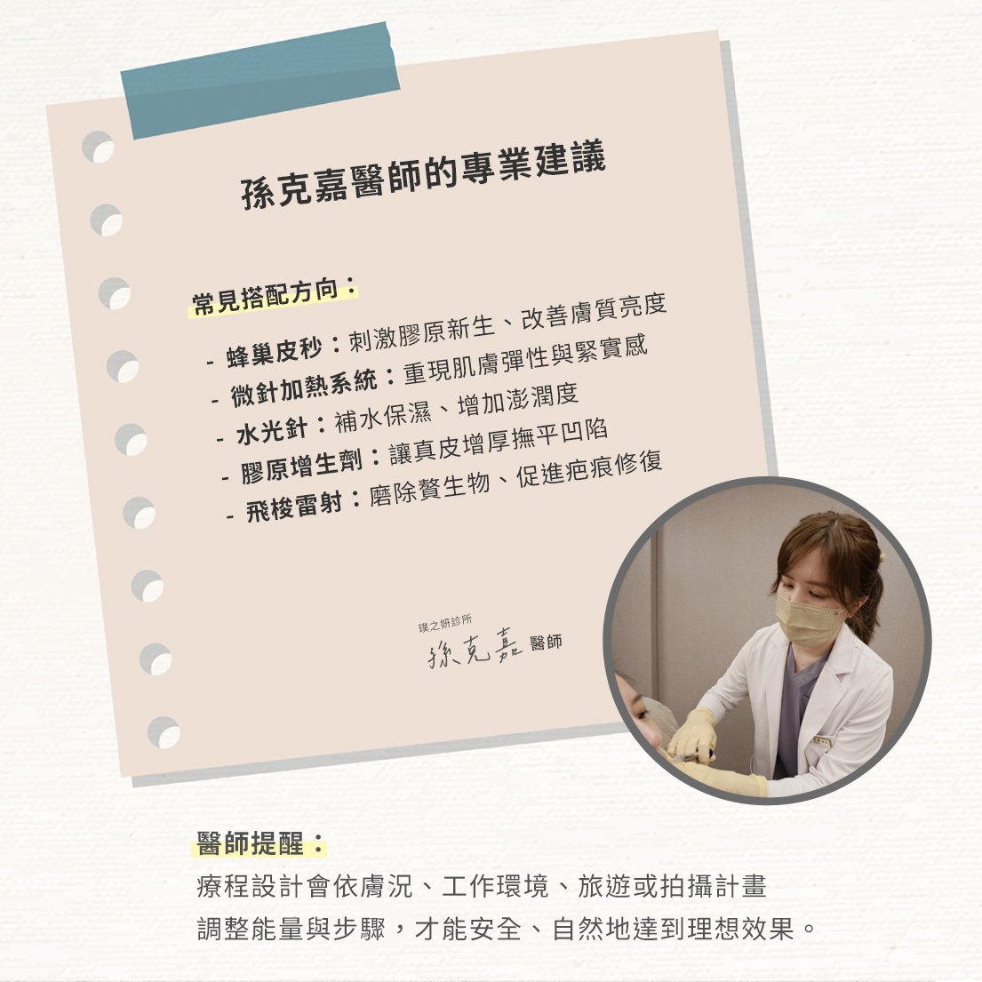 因此在診間,會依據每個人的情況,給出不同的配套方案。蜂巢皮秒運用光電效應的原理新生膠原蛋白;微針加熱系統給出膠原的緊實感;或者水光針藉由不同材料的注入,達到保水度的澎潤提升,或是膠原增生劑讓真皮組織新生厚度撫平凹陷區。配合其他雷射機器,例如飛梭式雷射磨除贅生物,或針對沾黏的疤痕組織做鬆動讓再生效率提升,都是做完整療程規劃時要一並考慮的。此外,每個人現在的膚況,平常工作的環境狀態,近期是否有出遊或攝影規劃,都會影響著療程設計及能量配比。