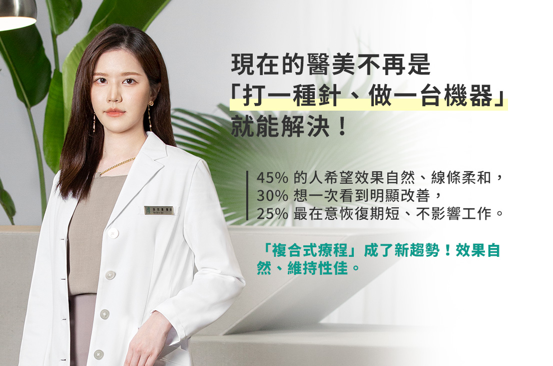 以上都是我在診間常遇見的問題。根據醫美市場統計,大約有 45% 的消費者希望效果自然、線條柔和;30% 想要一次就看到明顯改善;剩下 25% 則最在意恢復期短、不影響工作。這三種需求,也讓醫師在設計療程時,越來越強調客製化與組合搭配。事實上,經過多年來醫療科技的推陳出新,我們手邊的武器選擇變多,醫美已經不再是「打一種針,做一台機器」那樣一翻兩瞪眼的解決模式。越來越多人追求的是「自然變美、維持久一點、又不想覺得怪,被看出來做了什麼」,因此「複合式療程」成了最新的趨勢。