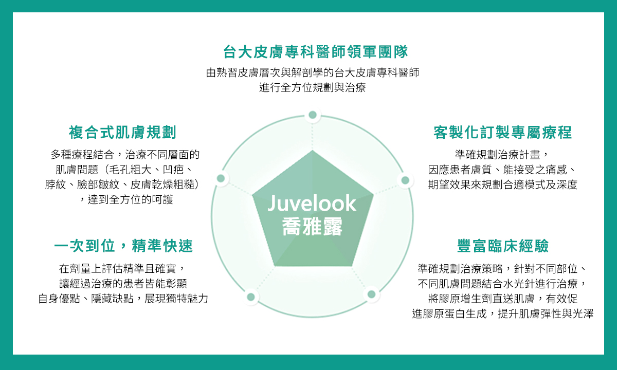 喬雅露小分子劑型— Juvelook 50mg 具有細緻的粒徑,是目前唯一可用於真皮層的組織增生劑,對於膚質紋理改善有極大幫助。