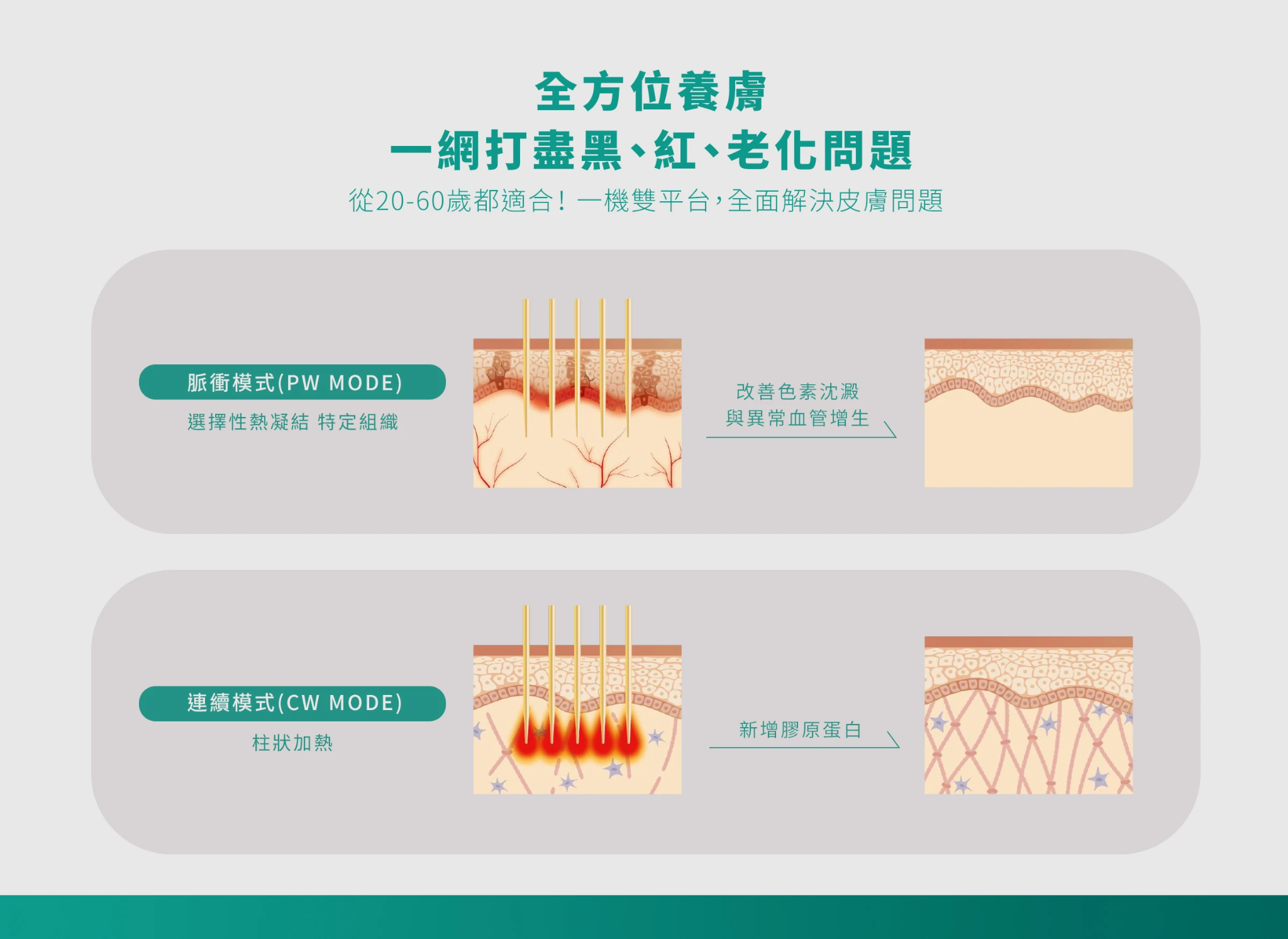 在全真皮層進行加熱,以最大化治療效果,適合想要皮膚緊緻拉提、淡化細紋、緊緻毛孔、改善痘疤等患者。